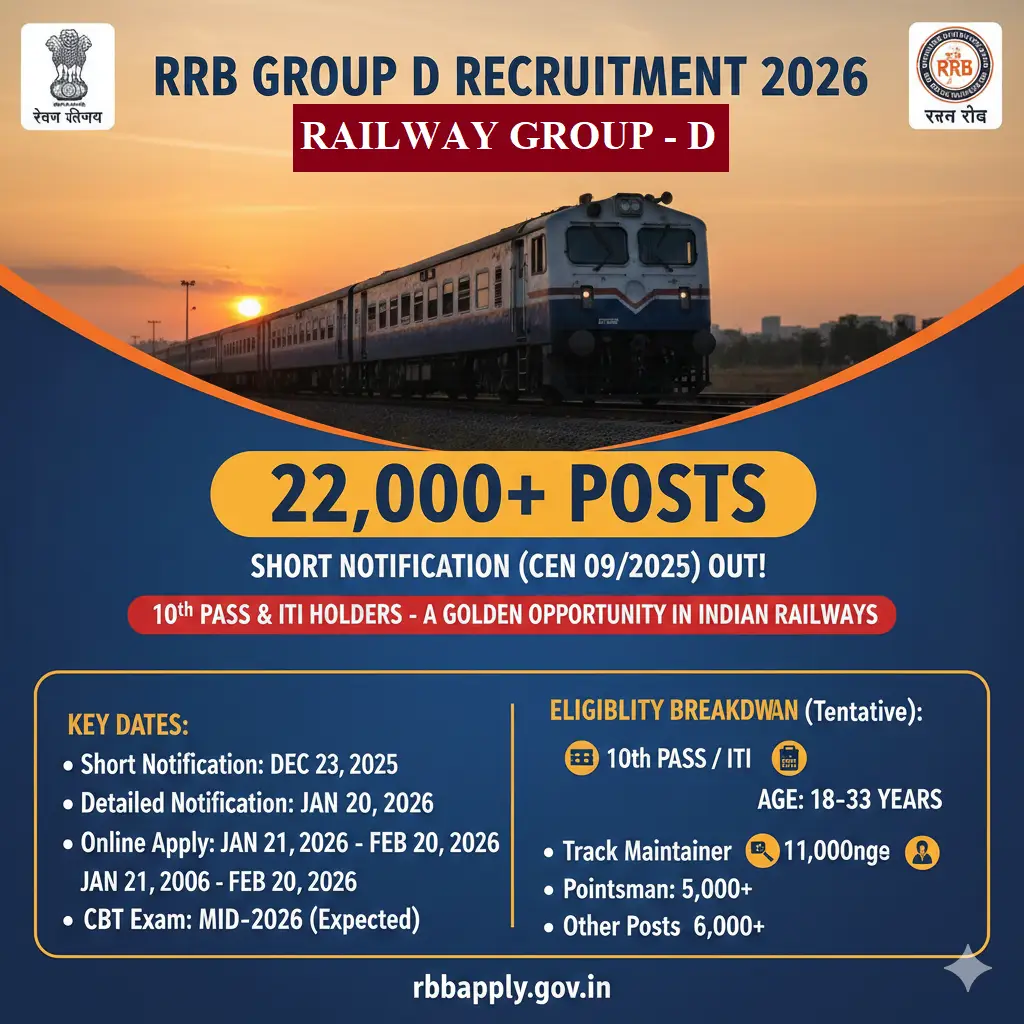 RRB Group D Recruitment 2026– सरकारी नौकरी का इंतजार कर रहे विद्यार्थियों के लिए अच्छी खबर है | रेलवे भर्ती बोर्ड ने रेलवे ग्रुप डी भर्ती 2026 का ऑफिसियल नोटिफिकेशन जारी कर दिया है। जो रेलवे ग्रुप डी भर्ती 2026 के लिए एलिजिबल है। वह विद्यार्थी ऑनलाइन आवेदन 21th January 2026 to 20th February 2026 के मध्य आवेदन कर सकता है। रेलवे ग्रुप डी भर्ती 2026 से संबंधित संपूर्ण जानकारी जैसे योग्यता, आयु सीमा, सिलेक्शन प्रोसेस, फॉर्म फीस, सिलेबस आदि की जानकारी इस आर्टिकल मे दी हुई है। इसलिए इस आर्टिकल को अंत तक जरूर पढ़ें………